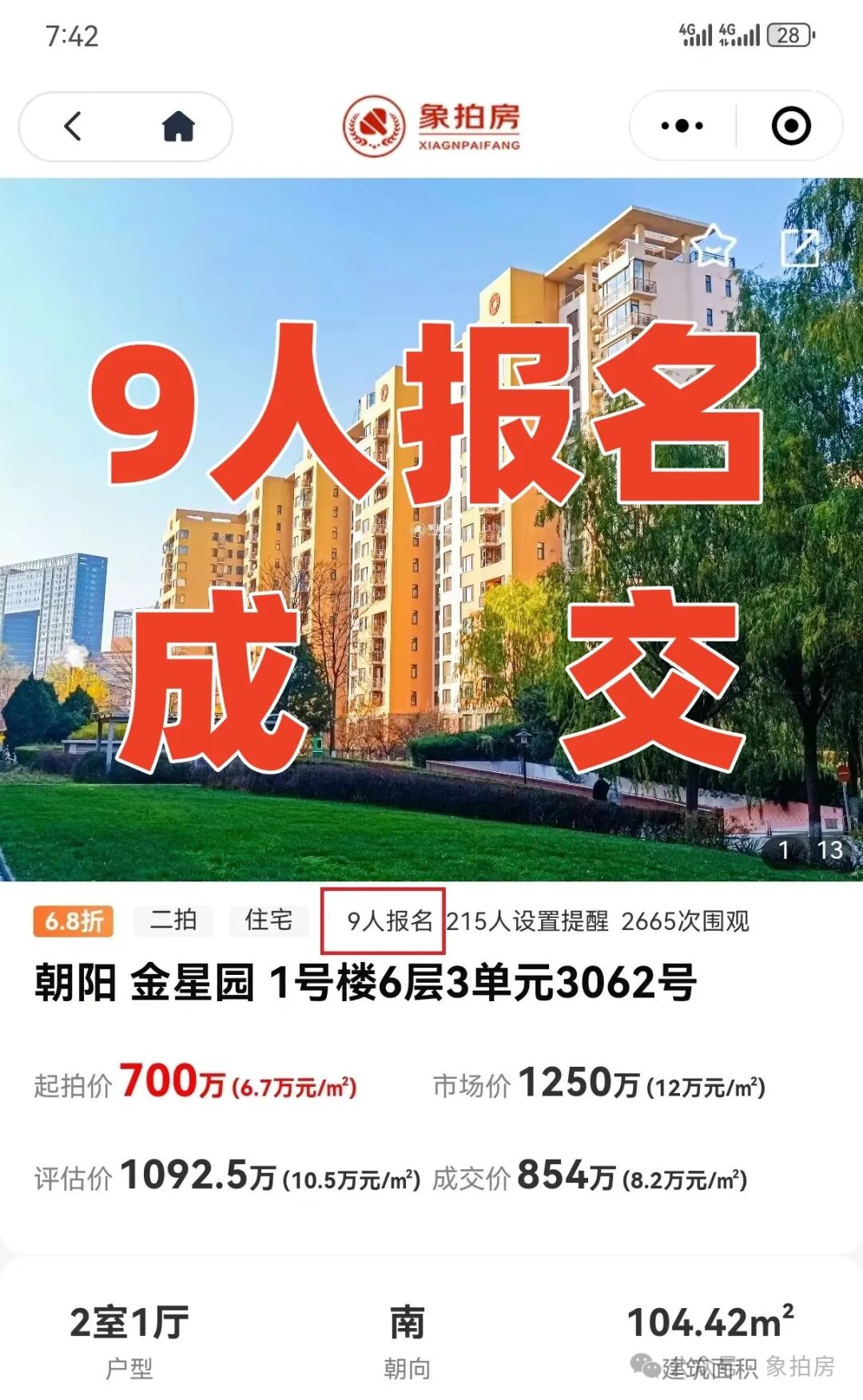 成交价格:854万,比一拍低了20万!