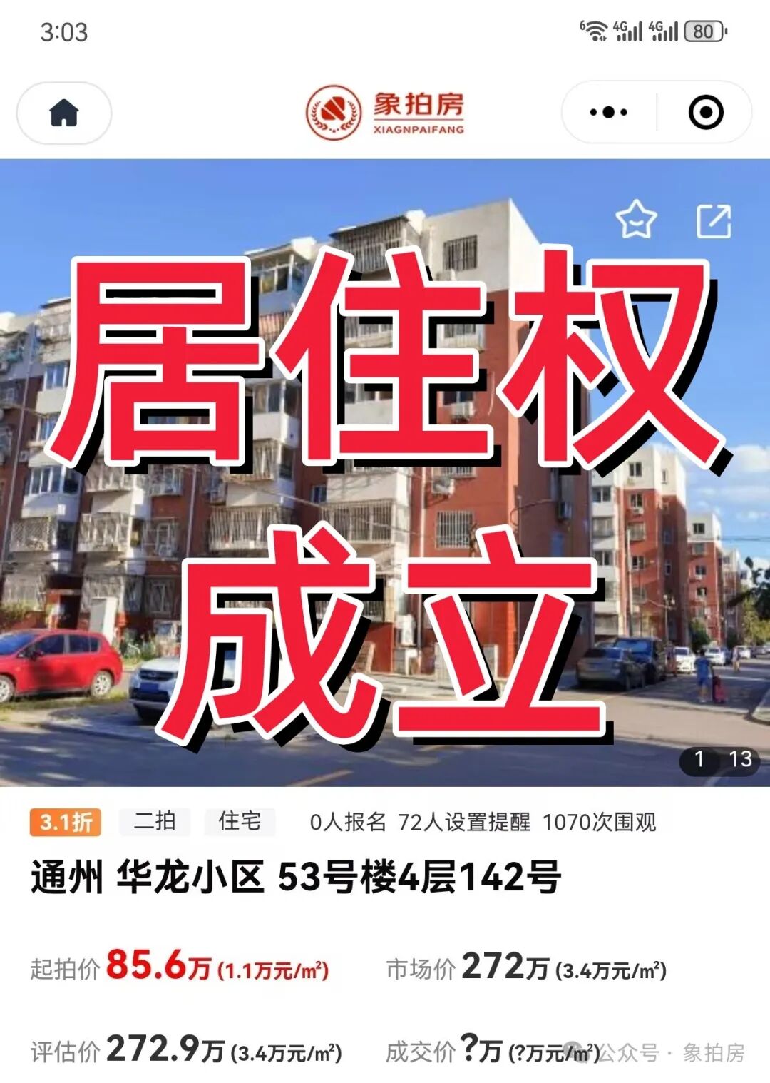 近日,北京上拍了一套位于华龙小区的80㎡两居室,起拍价仅80万元,这引起了广泛关注。然而,在象拍房小程序的拍卖公告中,出现了一句话令人警觉:【瑕疵(特别)说明: 根据北京市通州区人民法院做出的(2023)京0112民初24831号民事调解书,房屋可能存在永久居住权,竞买人需自行解决,相应风险由竞买人自行承担】。这一提示表明该房产可能涉及永久居住权问题,但法院并未明确表示是否存在,只要求竞买人自行判断风险。