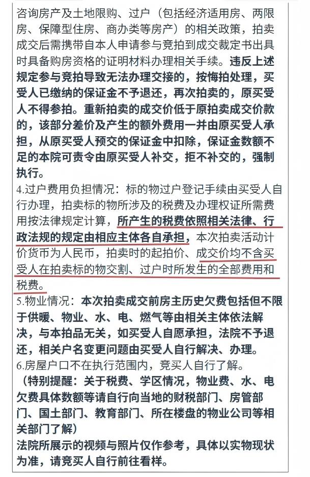 3、按照法律规定应由被执行人承担的税费(如个人所得税等),因执行程序限制,统一由买受人承担,不再退还。竞买人应在竞拍前充分了解相关税费政策,并合理测算竞买成本。