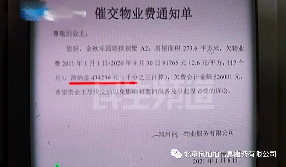 河南郑州的张女士通过司法拍卖以160万元的价格购得一套房子。当她准备进行装修时,物业公司向她发送了一张催缴物业费通知单,要求她支付2011年1月至2020年9月期间共计50多万的物业管理费。其中,9万多元是物业费,41万多元是滞纳金。因此,张女士与物业公司产生了争议。