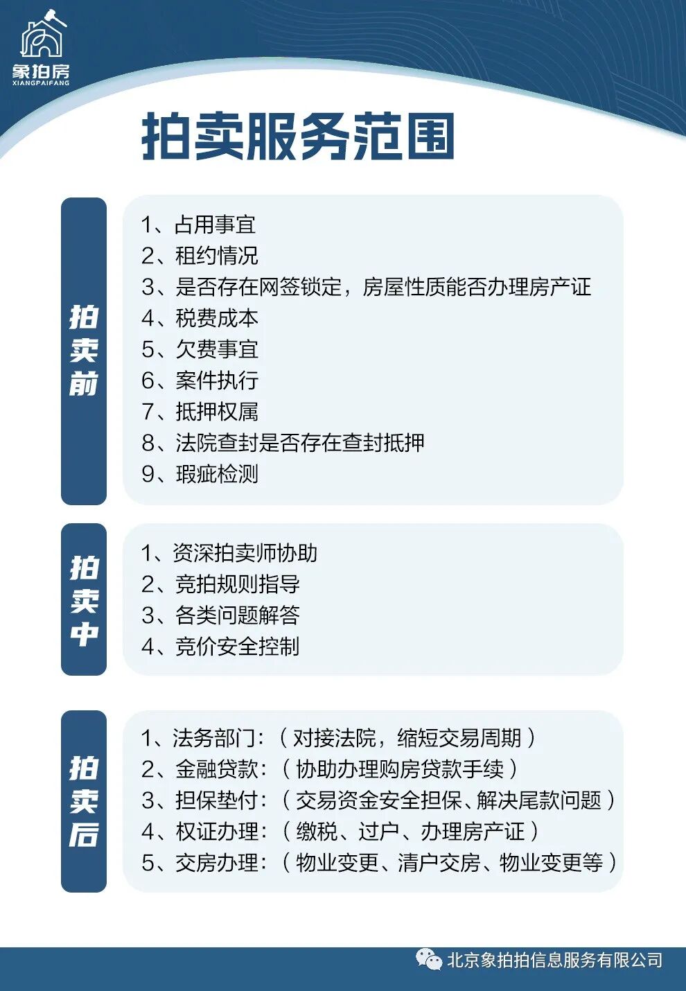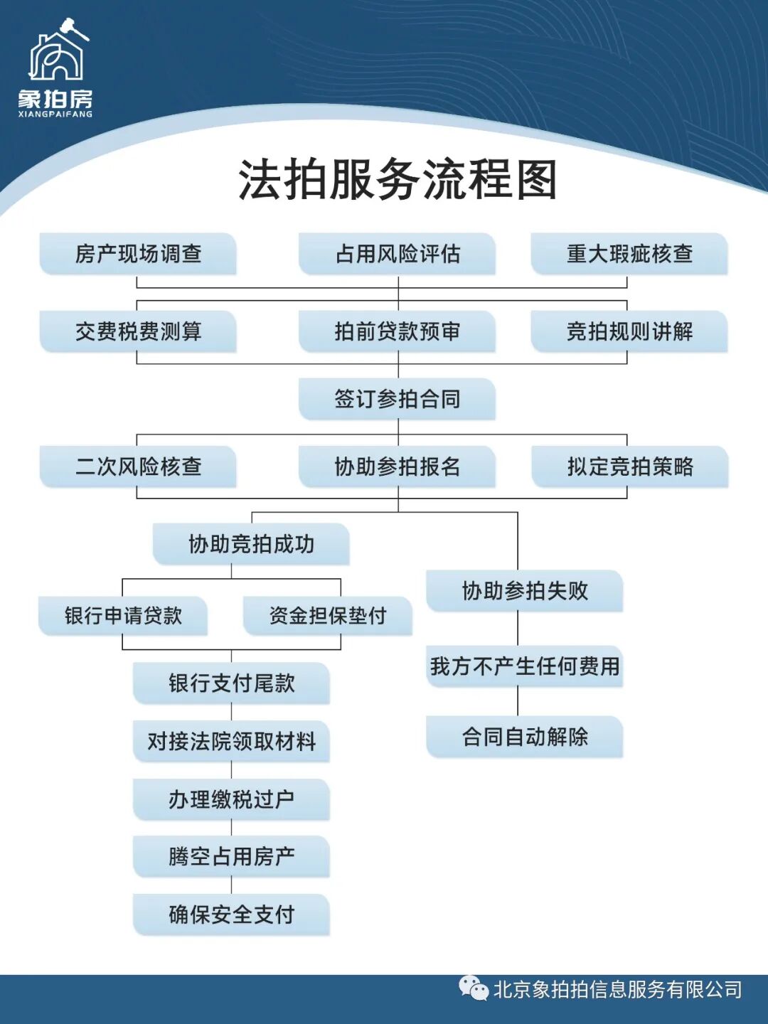 ——是全国法拍房领域保障服务公司,目前业务范围已涵盖北京法拍房、上海法拍房、深圳法拍房、广州法拍房、河北法拍房等多个城市。一流的法拍团队协助客户(竞拍前→竞拍中→竞拍后),一站式全流程服务,九大保障服务体系,让客户放心购买法拍房产。公司在司法拍卖业务辅助服务领域精耕细作,以出众的投资策略和高效的腾房经验,服务于上千位法拍客户,获得了上千位客户口碑似的传播,客户入住后依然持续服务负责到底,秉承着“一次委托,终身服务”的服务宗旨,为客户保驾护航!
